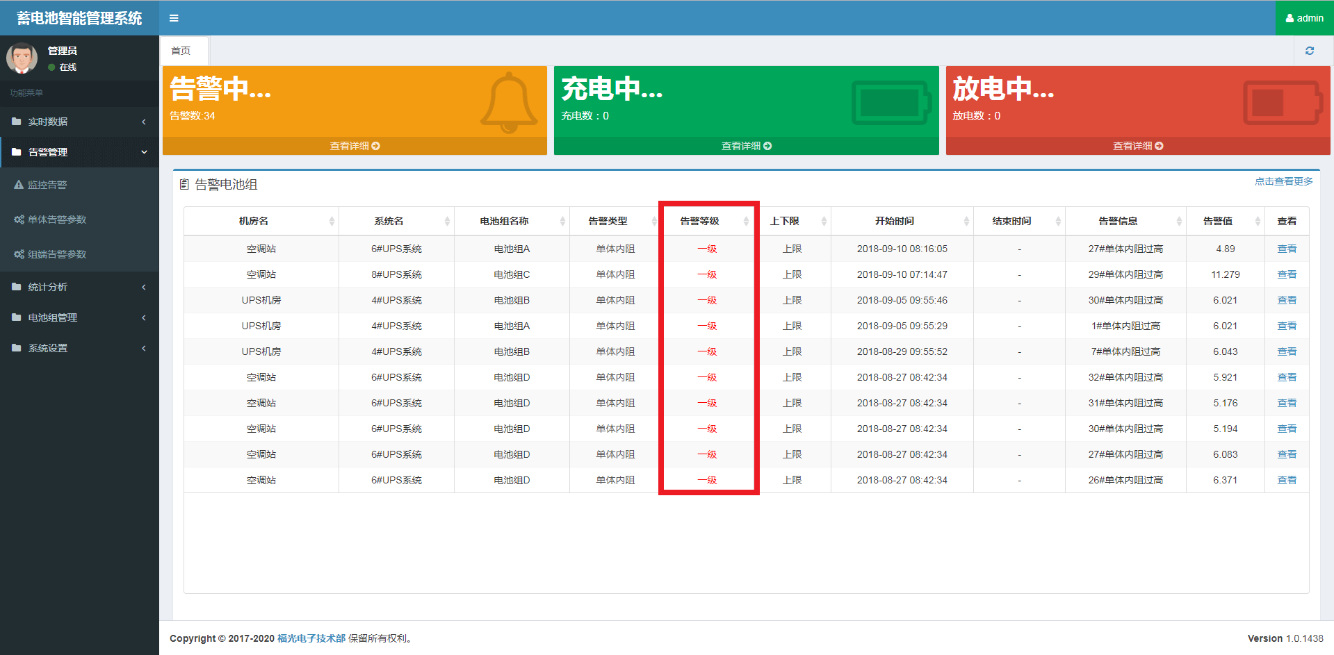 通過遠程管理平臺能對轄區內所有監測的蓄電池組進行站點信息管理、數據實時顯示、告警實時提示、歷史監控數據記錄、歷史充放電數據存儲、蓄電池性能分析、趨勢分析、統計分析、專業報表等。