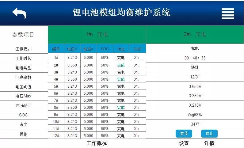 分別進行1)模組編號;2)選擇測試模式、電池類型;3)單體串數設定、設置目標閥值及對應的工作模式的測試電流;4)保存后進入均衡維護模式