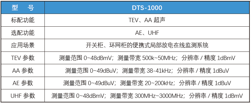 DTS-1000具有瞬態(tài)地電壓(TEV)、非接觸超聲波(AA超聲)、接觸超聲(AE)和特高頻(UHF)四種測試功能,適用于開關(guān)柜、環(huán)網(wǎng)柜的局放在線監(jiān)測,提供局放定性判定功能