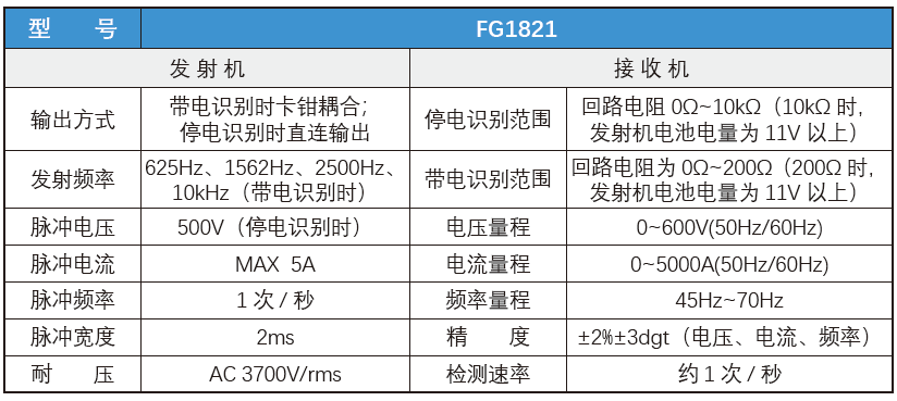 FG1821具有帶電電纜識別、停電電纜識別、交流電流測試、交流電壓測試功能。PA電子由發射機、發射電流鉗、接收機、接收柔性電流鉗等組成。