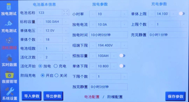 放電結束后,可直接對被測電池組充電。點擊【充電測試】,在【階段充電】處選擇開啟,點擊【階段設置】,即可針對充電過程4個階段進行參數設置,科學高效的充電方式,保證電池充滿且不損傷電池。