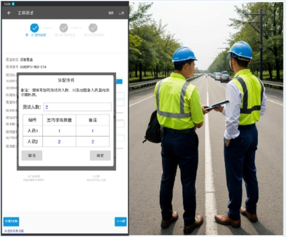 1)工單測試任務分配:系統內置一個智能任務分配??椋菹殖〔饈勻嗽斃棖螅孕蟹峙?。每個測試人員在系統中接收分配到的具體任務,包括測試地點、任務類型等詳細信息。