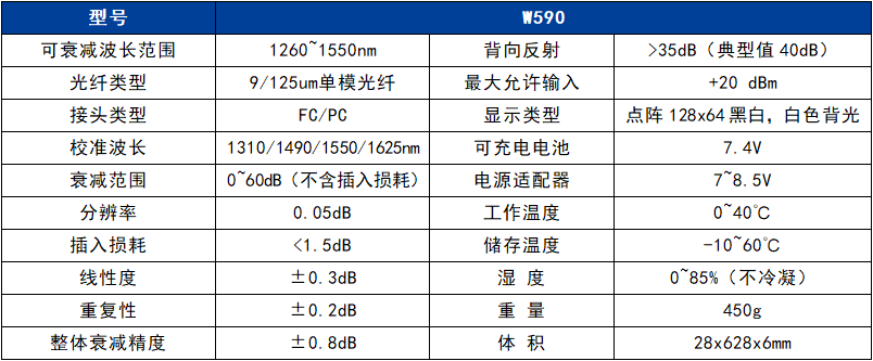 W590手持式數顯可變光衰減器采用一個中性的密度濾波器對光信號進行衰減。通過旋轉儀表前面板上的旋轉撥盤,可在2.5到60dB之間連續調整衰減值。該儀表是在光纖通信系統中模擬一段光纖線路上衰減的理想工具,它還可以用于系統驗證測試:例如在“接收機靈敏度”測試過程中,需要進行連續、定量的衰減調節。