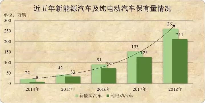 新能源汽車產業快速發展:隨著政策對新能源汽車的推廣,新能源汽車的數量持續攀升,到2018年底,全國新能源汽車保有量達261萬輛,占汽車總量的1.09%。