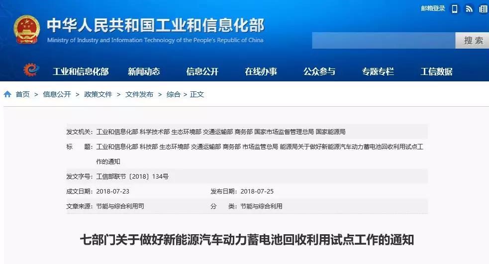 2018年7月25日,工信部等七部門聯合發布《關于做好新能源汽車動力蓄電池回收利用試點工作的通知》,擴大梯次利用試點范圍,以17個省市和地區以及中國鐵塔股份有限公司為試點,做好新能源汽車動力蓄電池回收利用試點工作。