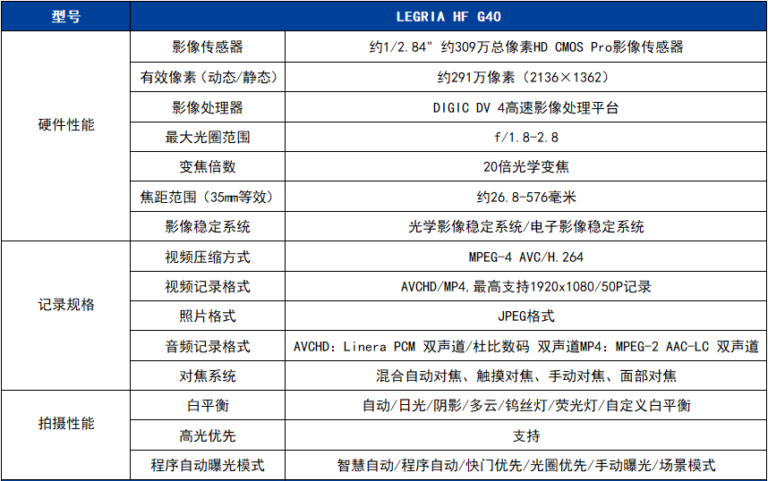 LEGRIA HF G40 采用了與專業級攝像機相同的攝像鏡頭、影像傳感器、影像處理器三大主要成像元件;并搭載了源自專業攝像機的伽馬曲線設置,讓用戶能體驗到專業級PA電子的高畫質。