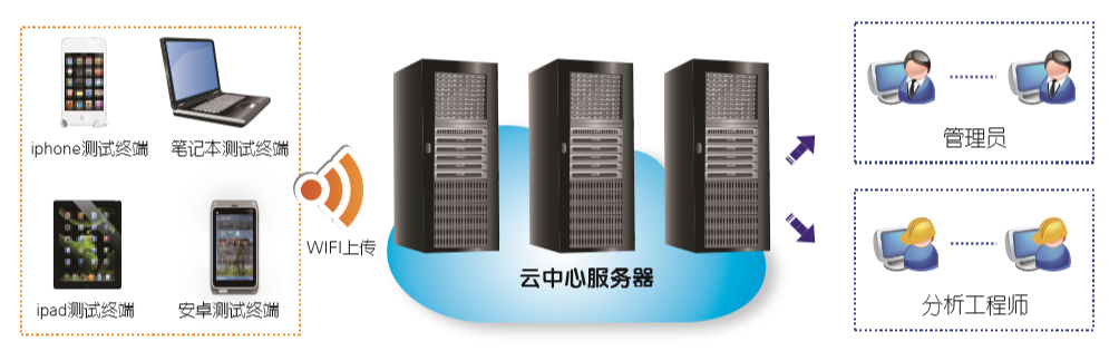 WLAN分布式管理優化平臺可以方便地將PC終端、手持式測試設備(Android和IOS)采集到的各種測試數據,通過網絡上傳到服務器,服務器對數據進行有序組織與管理, 并且通過Web的方式,靈活地將數據再現。