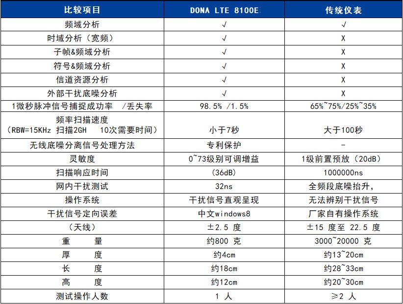 DONA  LTE 8100E 在線干擾分析儀可以幫助干擾排查工程師,快速發現干擾源,精確查找定位網內干擾、網外干擾、阻塞干 擾、設備干擾,是干擾排查的理想工具。